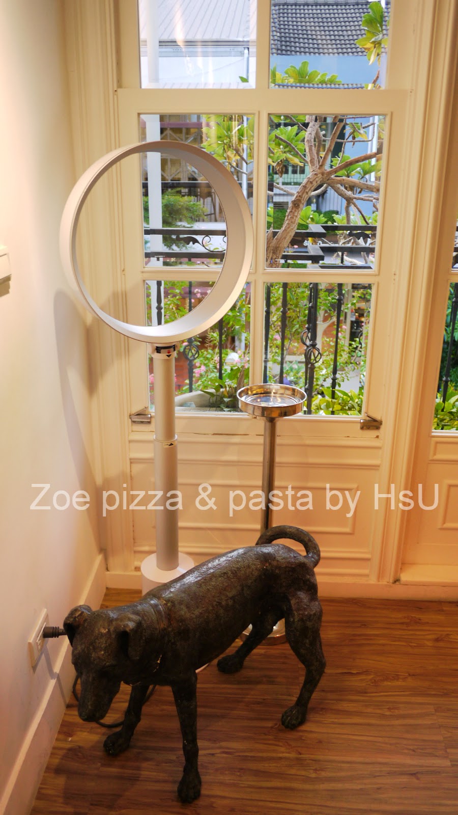 | 二樓角落的裝飾,好逼真的狗狗。戶外是小陽台,種了萬年青。 |